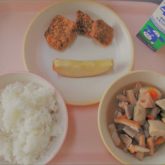 本日のメニューは、ごはん、のっぺい汁、いわしフライ、大根葉のごま炒め、節分豆でした。