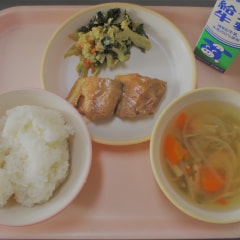 本日のメニューは、ごはん、すまし汁、さばのみそ煮、野菜のごま和えでした。