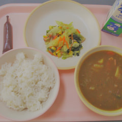 本日のメニューは、麦ごはん、冬野菜のカレー、小松菜のソテー、ミルメークココアでした。