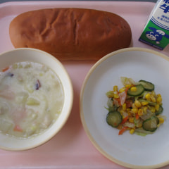 本日のメニューは、黒糖パン、さつまいもシチュー、コーンサラダでした。