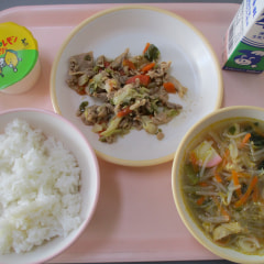本日のメニューは、ごはん、春雨スープ、豚肉と野菜のオイスターソース炒め、はちみつレモンゼリーでした。