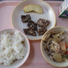 本日のメニューは、ごはん、けんちょう、鯨の竜田揚げ、りんごでした。