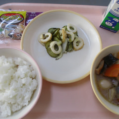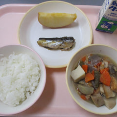 本日のメニューは、ごはん、筑前煮、いわしのみぞれ煮、りんごでした。
