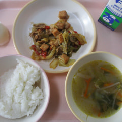 本日のメニューは、ごはん、ワンタンスープ、厚揚げと野菜の中華炒め、桃まんでした。