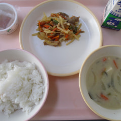 本日のメニューは、ごはん、豆乳みそ汁、じゃがいものきんぴら、納豆でした。