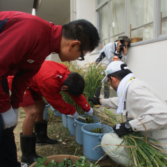 6月に体験したバケツ稲の「芽だし」「稲植え」に引き続き、本日「稲刈り」を体験しました。JAの方を講師にお招きし、稲の刈り…