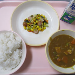本日のメニューは、麦ごはん、チキンカレー、チンゲン菜のソテーでした。