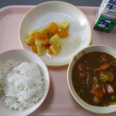 本日のメニューは、麦ごはん、秋の実りカレー、フルーツミックスでした。
