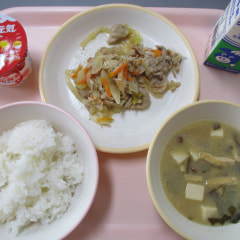 本日のメニューは、ごはん、なめこ汁、豚肉のしょうが炒め、ヨーグルトでした。