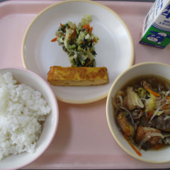 本日の給食は、ごはん、すきやき、五目厚焼きたまご、大根葉のごま炒めでした。