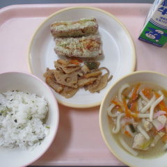 本日のメニューは、小松菜飯、五目うどん、ちくわの磯辺揚げ、れんこんのきんぴらでした。
