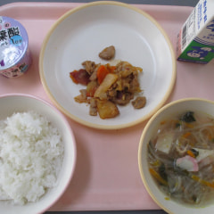 本日のメニューは、ごはん、春雨スープ、タッカルビ、ヨーグルトでした。