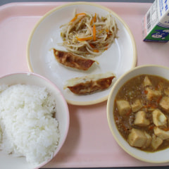 本日のメニューは、ごはん、マーボー豆腐、焼きぎょうざ、もやしの甘酢炒めでした。