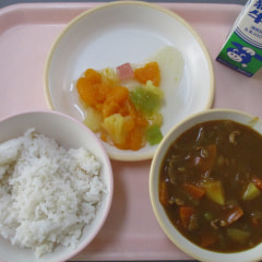 本日のメニューは、麦ごはん、ポークカレー、フルーツミックスでした。