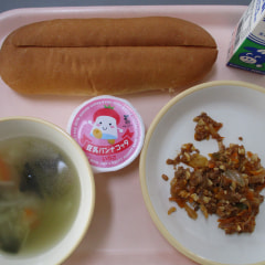 本日のメニューは、縦割りパン、野菜スープ、チリコンカン、豆乳パンナコッタでした。