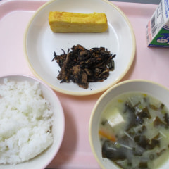 本日のメニューは、ごはん、みそ汁、ひじきごはんの具、山口県産厚焼きたまごでした。今週は地産地消週間です。宇部市や山口県で…