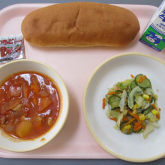 本日のメニューは、パン、県産いちごジャム、チキンビーンズ、野菜サラダでした。