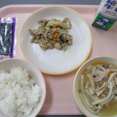 本日のメニューは、小ごはん、味付けのり、五目うどん、豚肉のみそ炒めでした。