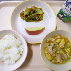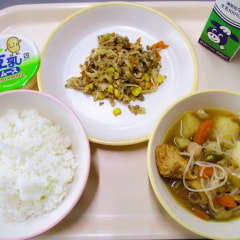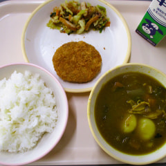 本日のメニューは、ごはん、カレー風すいとん汁、メンチカツ、野菜のおかか炒めでした。