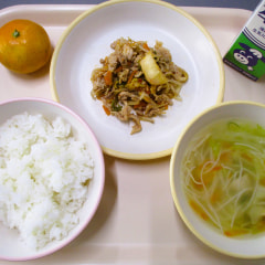 本日のメニューは、ごはん、ビーフンスープ、豚キムチ、西岐波みかんでした。