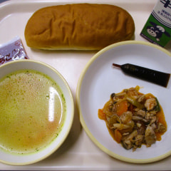 本日のメニューは、パン、いちごジャム、ABCスープ、鶏肉のワイン煮、ミルメークコーヒーでした。
