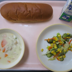 本日のメニューは、黒糖パン、クリームシチュー、コーンサラダでした。