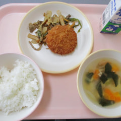 本日のメニューは、ごはん、豆腐汁、チキンカツ、ごぼうのきんぴらでした。