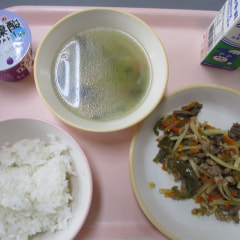 本日のメニューは、ごはん、ワンタンスープ、チンジャオロース、ヨーグルトでした。