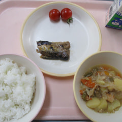 本日のメニューは、ごはん、じゃがいものそぼろ煮、いわしのみぞれ煮、ミニトマトでした。