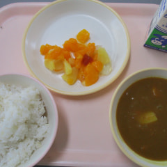 本日のメニューは、麦ごはん、チキンカレー、フルーツミックスでした。