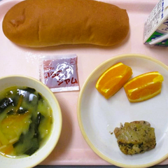 本日のメニューは、パン、いちごジャム、コーンスープ、鶏肉のハーブ焼き、オレンジでした。