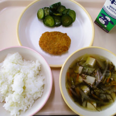本日のメニューは、ごはん、もずく汁、イカメンチカツ、ぴりからきゅうりでした。