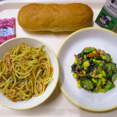 本日のメニューは、小パン、マーシャルビーンズ、焼きそば風スパゲティ、小松菜サラダでした。
