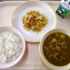 本日のメニューは、麦ごはん、秋の実りカレー、キャベツのごま酢炒めでした。