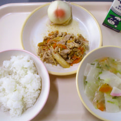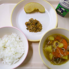 本日のメニューは、ごはん、じゃがいものうま煮、スタミなっとう、りんごでした。