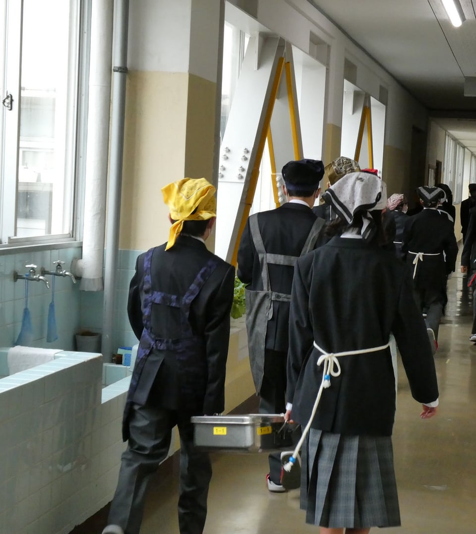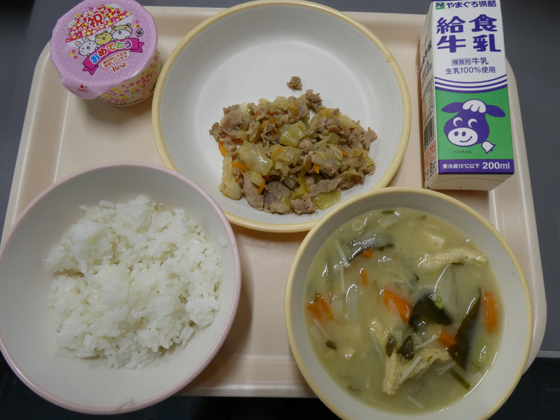 本日の給食は、みそ汁、豚肉のしょうが炒め、お祝いゼリー、ごはん、牛乳でした。給食前には当番がマナー良く一列に並んで、教室から給食室に向かいます。今日もおいしい給食をごちそうさまでした。