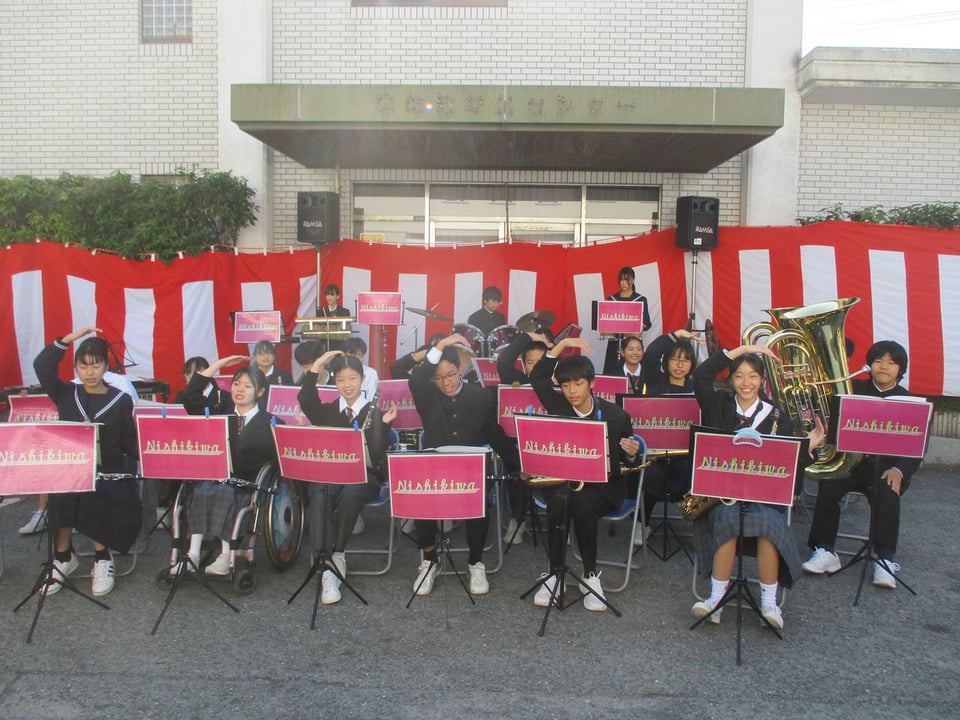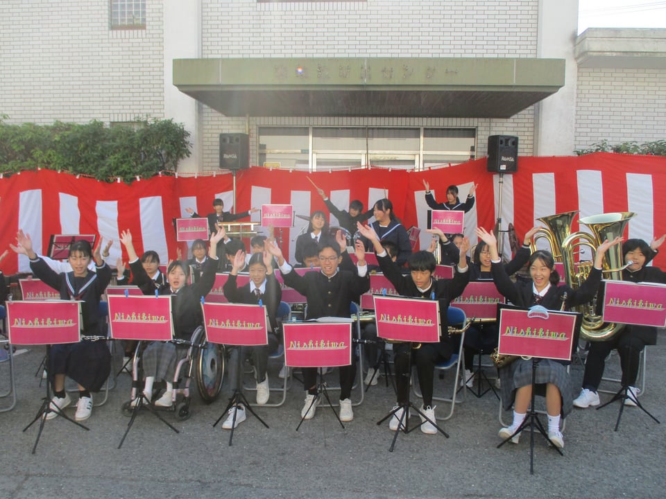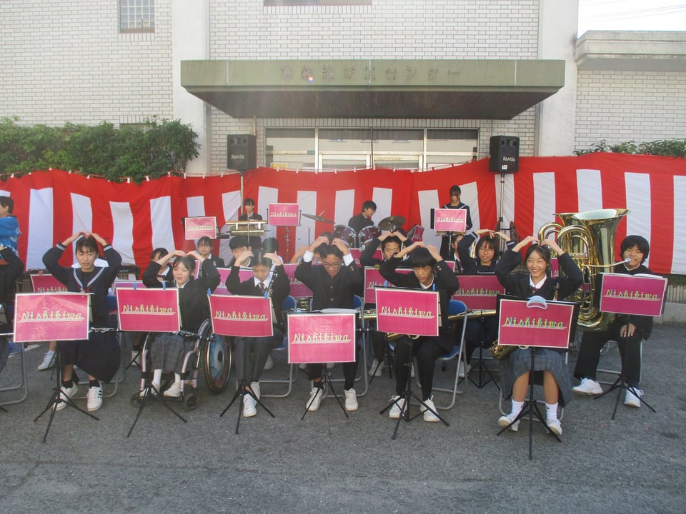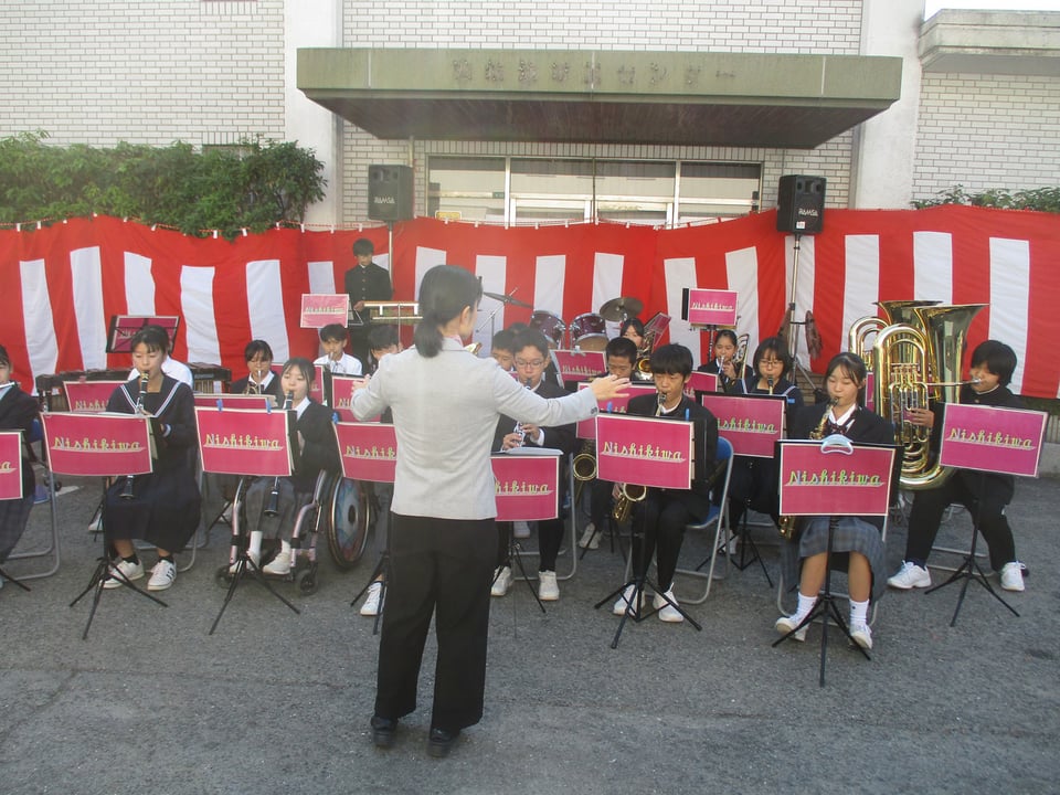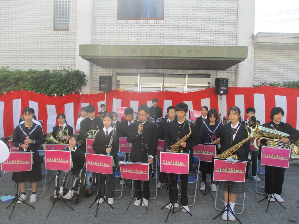明日は雨予報のため、明日予定されていた吹奏楽部による演奏は、急遽本日昼前に披露することとなりました。3年生が引退し、1・2年生だけによる初めての演奏でしたが、全部で4曲披露し、観客として来ていた3年生も「うまくなっていて感動した!」と喜んでいました♪