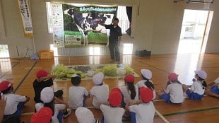 7月3日(水)モーモースクールがありました。山口県畜産振興協会や山口県酪農乳業協会、山口県美祢農林水産事務所、酪農家の方に来ていただき、1・2年生が子牛と触れ合ったり、バターづくりや乳しぼりを体験したり、畜産物や畜産について学んだりしました。