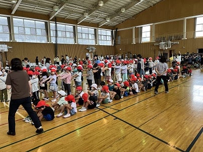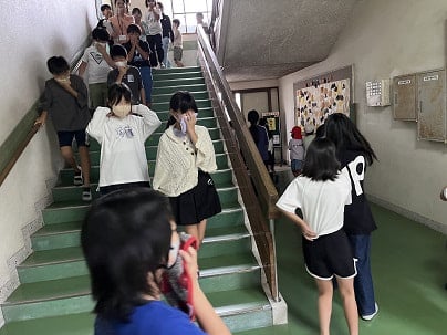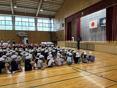 10/3は、火災を想定し、宇部中央消防署の方にも来ていただき、避難訓練を行いました。あいにくの雨模様でしたので、今回は火元から離れたルートで体育館へ避難する訓練です。ほとんどの人が、合言葉の「お(押さない)は(走らない)し(しゃべらない)も(戻らない)」を守って行動することができ、6分33秒で700人を超える児童が避難を終えることができました。どんな時も、落ち着いて避難できるようにしっかりと訓練することができました。