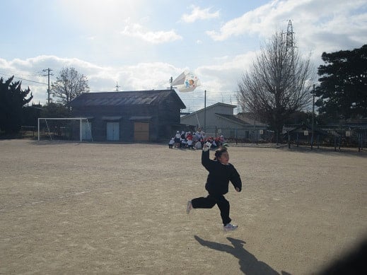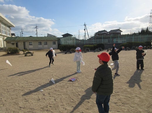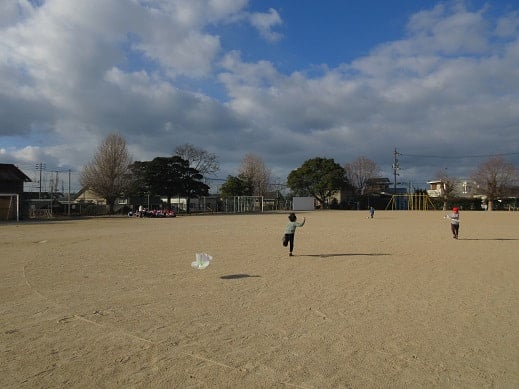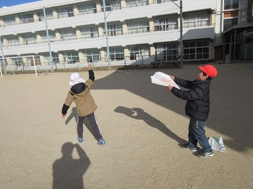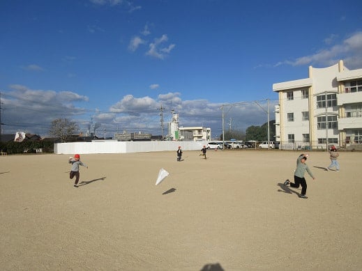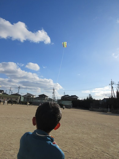 凧あげは、無病息災や子どもの健やかな成長を願うお正月遊びです。空高く、凧をあげ、空に願いを届けるという縁起のいい遊びでもあります。1年生がお手製の凧をつくり、凧あげをしていました。少し風が吹いていた23日は、絶好の凧あげ日和。グラウンドを全力ダッシュで駆け抜け、上手に凧をあげている子どもたちがいました。1年生には、糸を手繰ることが難しかったようですが、とても楽しんで凧あげをしていました。