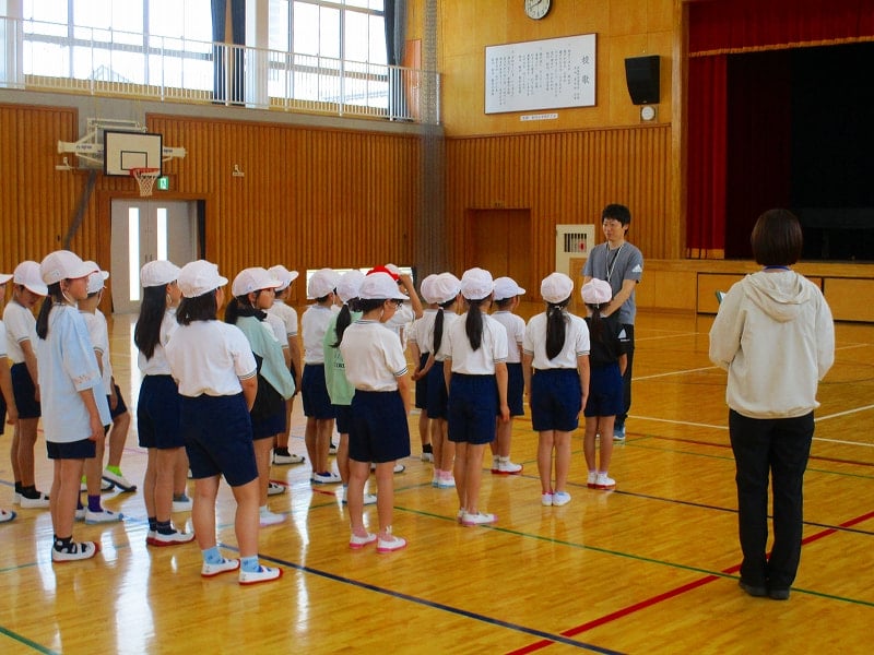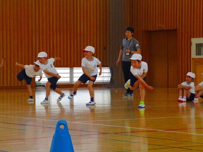 蔵本先生は体育が専門。5月の新体力づくりに向けて、体づくりを意識した体操や、身近な物を使ったゲーム、ボールの投げ方等、子どもが夢中になるような楽しい活動をテンポよく取り入れていました。