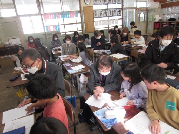 民生委員さんと3年生が冬の俳句作りに挑戦しました。冬の季語や俳句の技法(5・7・5、体言止め、比喩)の確認をした後、一人ひとりで俳句を作り、グループで1句選んで紹介し合いました。