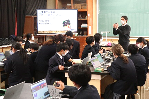 12月17日(水)・18日(木)、1年生を対象とし、本校にて、宇部工業高等専門学校の学生と先生にプログラミングの出前授業を実施していただきました。パソコンとデバイスを用いて、じゃんけんマシンを作りながら、プログラミングの基本について学んでいきました。生徒たちは、楽しみながら熱心に取り組んでいました。今後も、宇部高専との交流を深めていきたいと思います。
