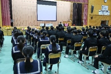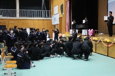 卒業式に先駆けて、3月4日(水)、在校生による「3年生を送る会」を開催しました。生徒会役員の「対面で会を行いたい」という強い想いがありましたが、インフルエンザ感染予防のため、残念ながら、1・2年生についてはオンラインでの参加となりました。会では、3年部の先生に関するクイズが出され、3年生は笑顔で答えていました。