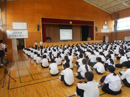 7月18日の全校集会では、新聞コンクールの表彰と学級目標の発表がありました。